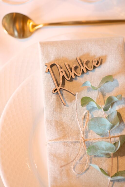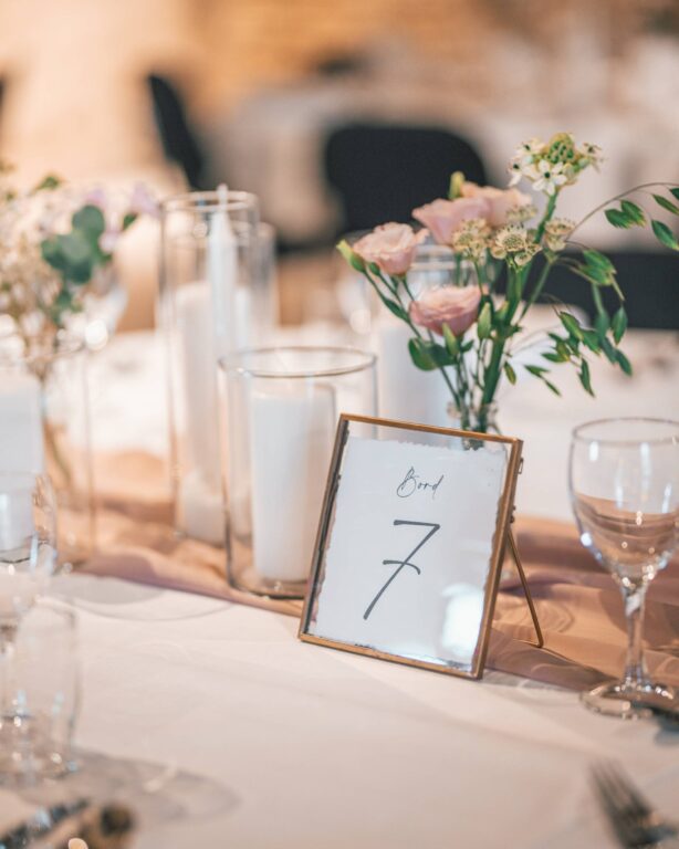 Til en festlig bryllupsmiddag til højbordene ser jeg oftest, at brudeparrene anvender en helt klassisk hvid dug på bordene. Når man som brudepar har lyst til at sætte sit eget præg, så er det helt oplagt at bruge vaser og glas med farver. De må endda gerne blandes, såsom okkerfarver og grønne glas, som giver en smuk dybde og samspil til de stilrene duge.