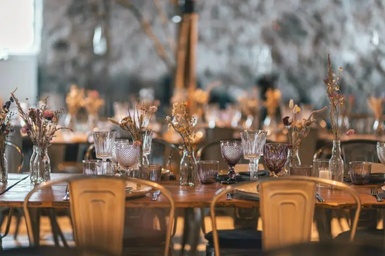 Til middagen blev langborde dækket med ‘’nature’’ stentøj, farvede glas og små buketter af tørrede blomster. I alt deltog 130 voksne og 70 børn i festen, der fortsatte til langt ud på natten.