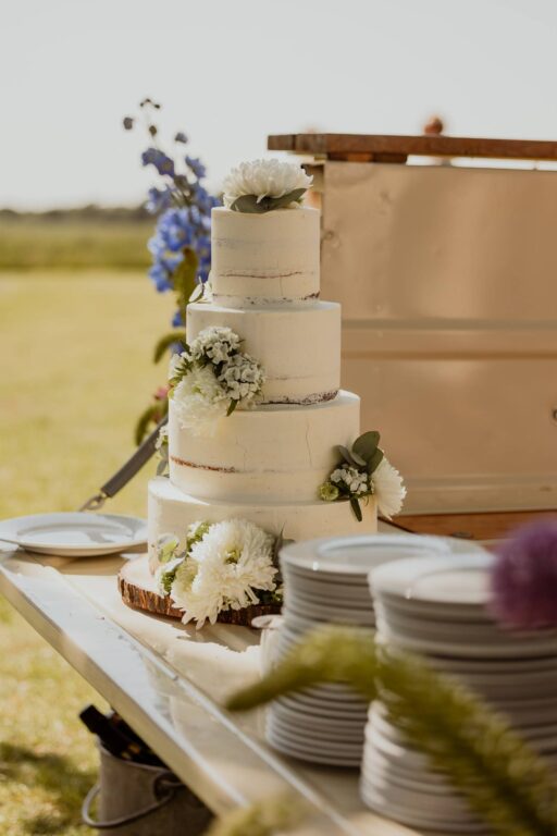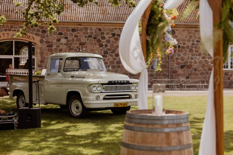 Efter vielsen blev pynt fra ceremonien flyttet og genbrugt til receptionen. Gittes pick-up truck blev forvandlet til både bar og kagebord – med en smuk naked cake fra Cake Creations, som høstede meget ros.