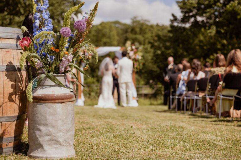 Fredagen stod i kærlighedens tegn – og i solskin. Vielsen blev holdt på godset i smukke sommerlige rammer skabt af Gittes team og med blomsterdekorationer fra The Flower Arrangement.. Bruden blev ført op ad gulvet af sin mor til Kina Grannis’ version af Can’t Help Falling in Love – en reference til Crazy Rich Asians – et smukt øjeblik.
