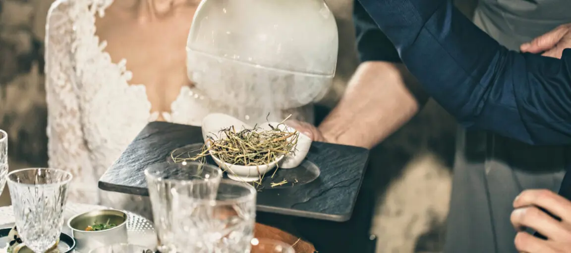 Thomas satte ild til en tot hø, der lå i osteklokken. Når gæsterne løftede låget spredte røgen sig som en magisk tåge fra et eventyr. Det var en oplevelse for alle sanser!