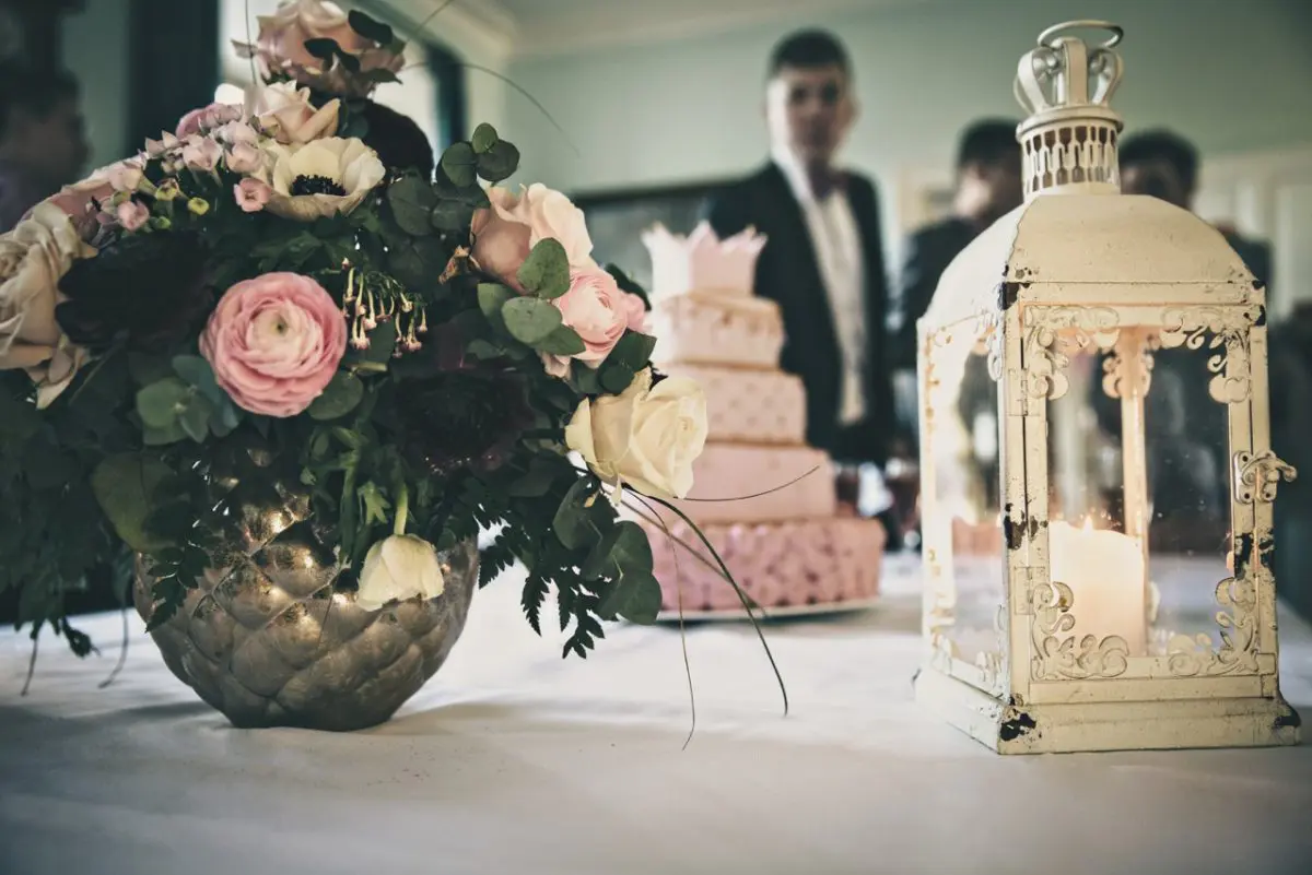 Efter gudstjenesten tog fotografen nogle billeder i kirken og vi ankom til godset kl. 12.00. I ankomststuen stod en velkomstdrink klar – en lyserød rosé. På bordet stod også den fineste dåbskage til beundring, så kunne gæsterne få et lille smugkig på, hvad de skulle glæde sig til senere.
