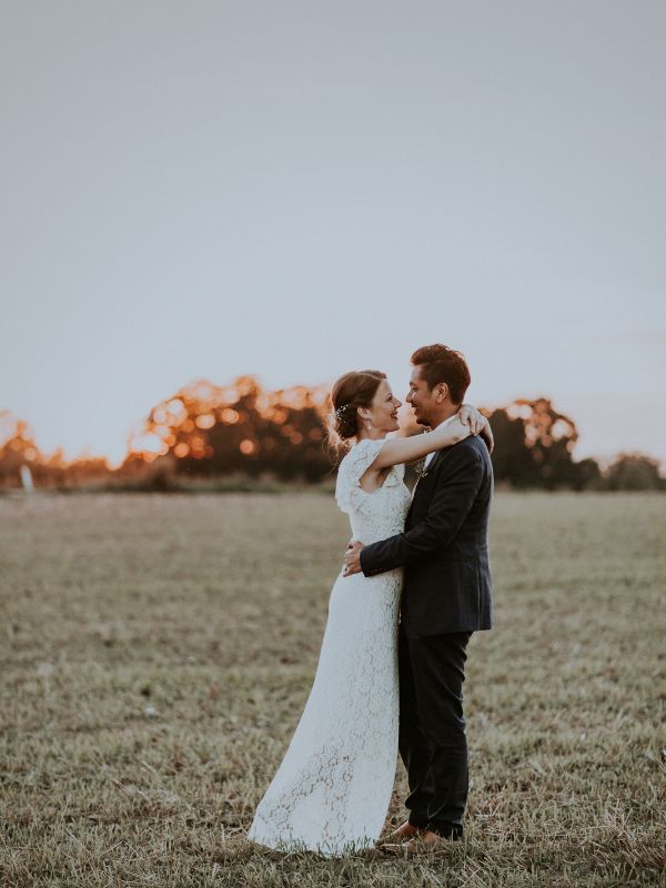 Vielsen var stillet op ved søen med siddepladser på halmballer og en fin vielsesportal med blondestof og blomster. Det var rigtig dansk sommerstemning i danske omgivelser – perfekt til Lones ønsker. Giftefogeden gjorde vielsen personlig og et familiemedlem spillede musik.