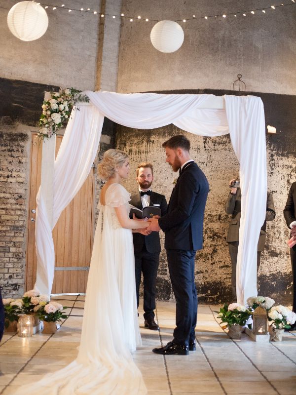 Med smukke forårsblomster i bjælkerne, 80 bloklys fordelt rundt i lysekronerne, stof i loftet, lyskæder, rispapirslamper og en smuk pyntet vielsesportal ventede hele selskabet på, at bruden og hendes far skulle komme gående op ad gangen.
