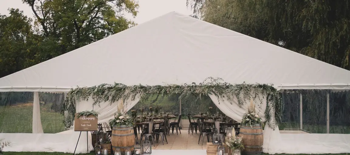 En vielse i teltet er perfekt – selv hvis vejret er dårligt, og I må ty til plan B. Teltet kan udvides, så der er god plads til en vielse med siddepladser.