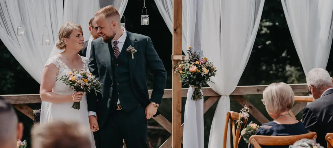 Brudeparret blev viet af Livsceremonier. De er et godt alternativ til jer, der ikke ønsker en kirkelig vielse. Bliv klogere på vielser uden for kirken.