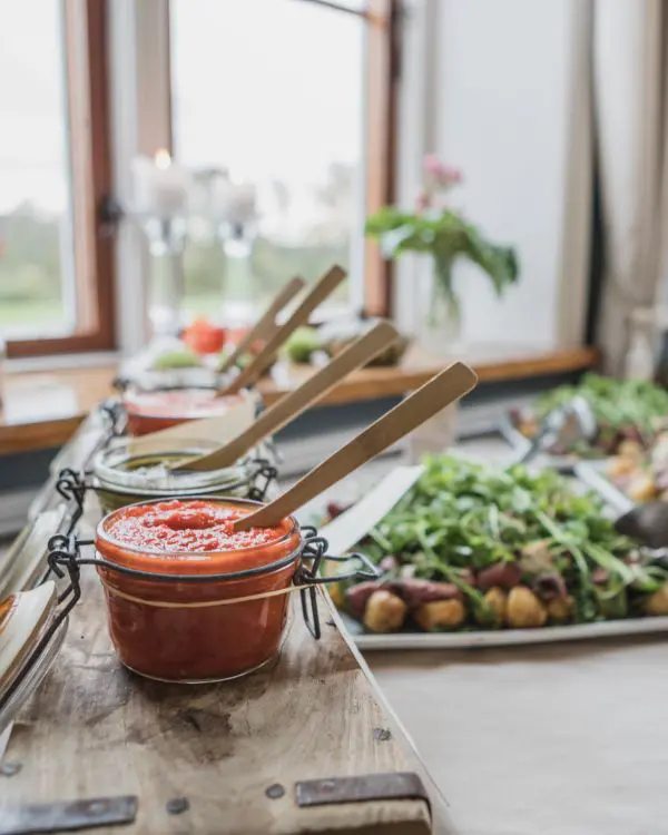 Som tilbehør serveres stor lækker buffet med broccolisalat (som altid ryger hurtigt), og mange andre lækkerier. Til dessert bliver der serveret klassisk, dansk æblekage, med æbler fra godset.