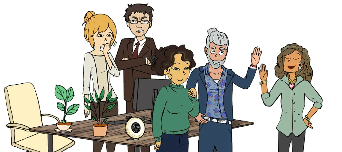 Hvis du synes, at Lars, Niels, Hanne og Sonja virker som nogle meget karikerede typer, så er du ikke helt galt på den. Vi har designet deres karaktertræk ud fra DISC, som er et udbredt værktøj til at forstå mennesker gennem persontyper. Deres efternavne gemmer på et lille hint om, hvilke DISC-profiler de hver især har.
