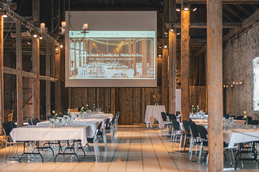 Unikt kursuslokale med store muligheder. 538 kvadratmeter & 11 meter til loftet. Plads til 400 deltagere, men kan nemt deles ind til mindre hold. Adgang til skov.