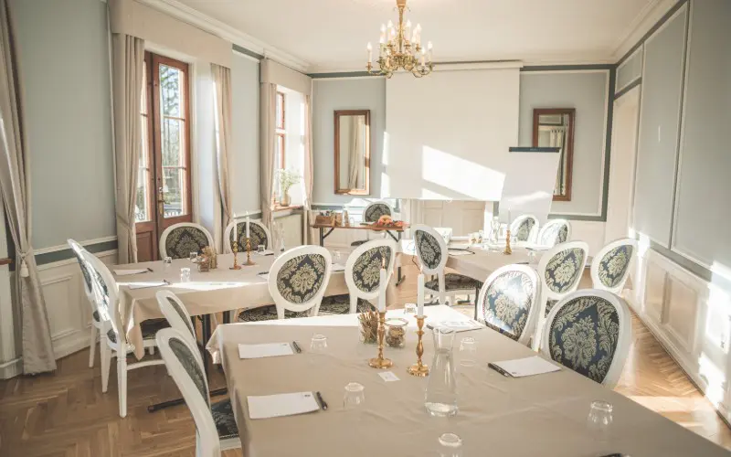 Plads til 18 personer i plenumlokalet. Her foregår mødet i et hus med pejsestue, entré og cigarværelse. Træk udenfor til en walk-and-talk i parken eller en kop kaffe på søterrassen.